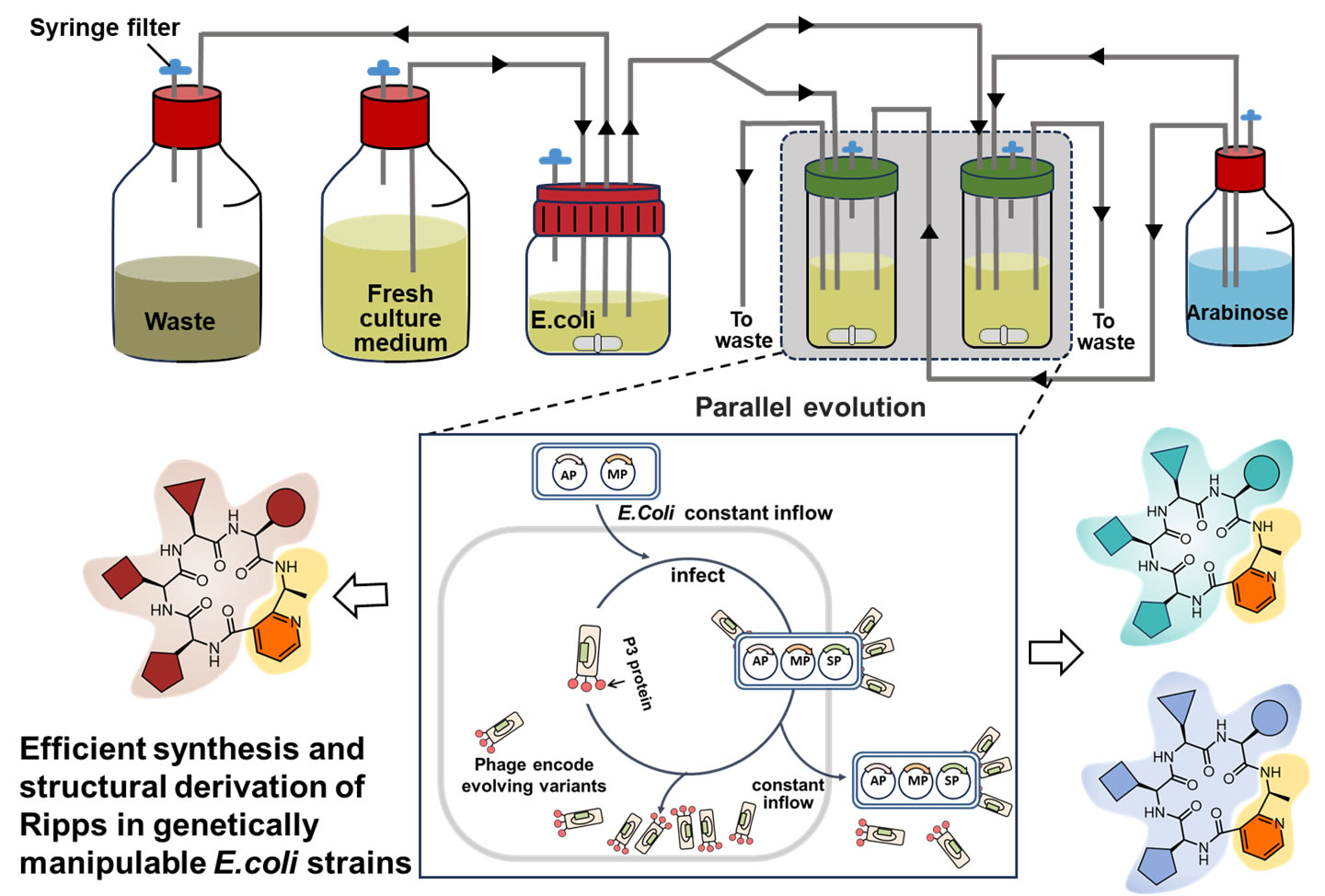 Peptide natural products often exhibit intricate structural diversity and possess significant biological activity, rendering them pivotal in the field of chemical biology and the development of innovative drugs throughout history. However, their complex structures pose challenges to current methods of chemical synthesis and biosynthesis. Based on the unique biosynthetic logic of ribosomal peptide natural products, we proposes an innovative approach that integrates phage life cycles with ribosomal peptide biosynthesis through ingenious design of gene transcription elements. Our goal is to establish a phage-assisted ribosomal peptide biosynthesis gene cluster directed evolution system, enabling the efficient synthesis and structural derivation of ribosomal peptides in genetically manipulable E.coli strains.