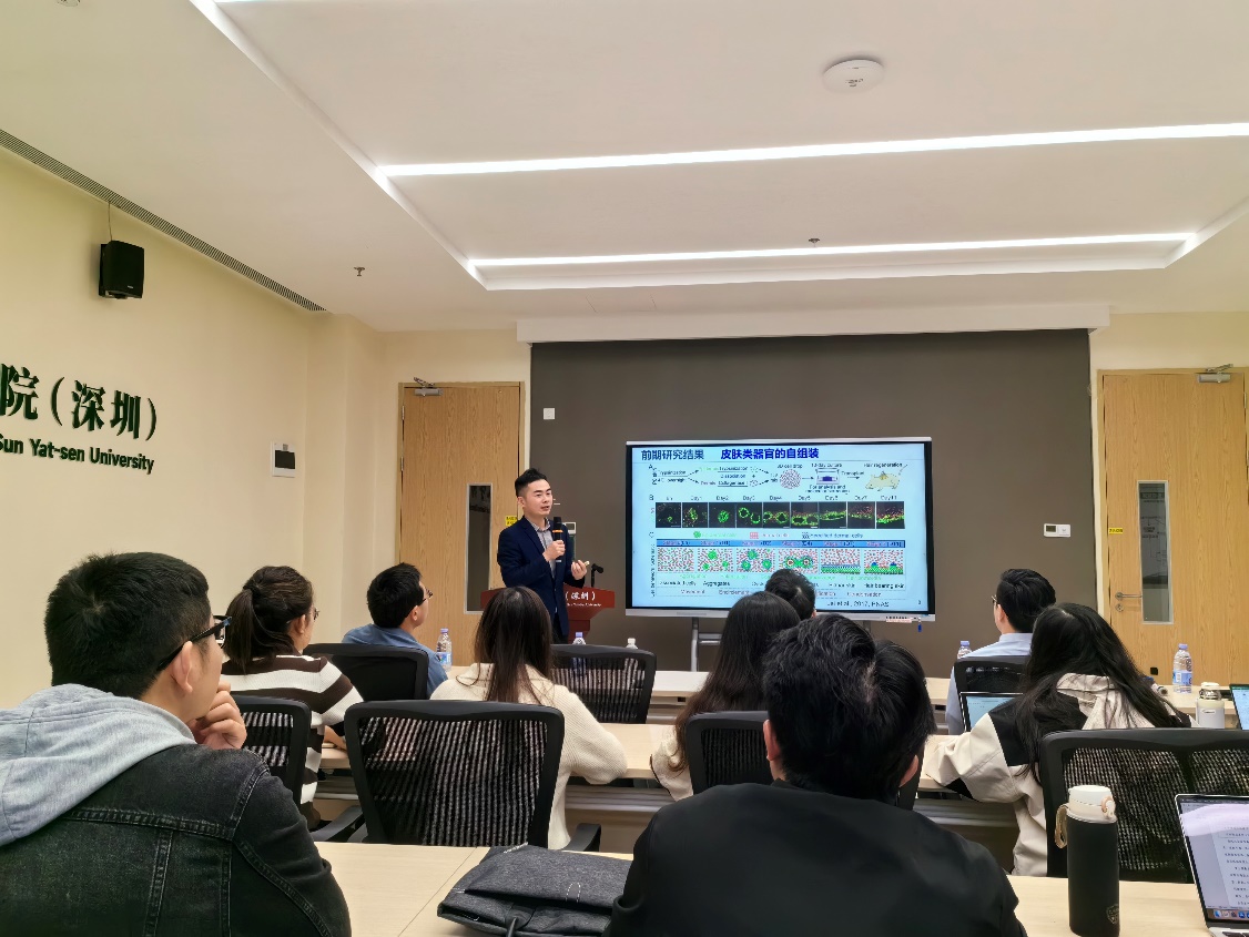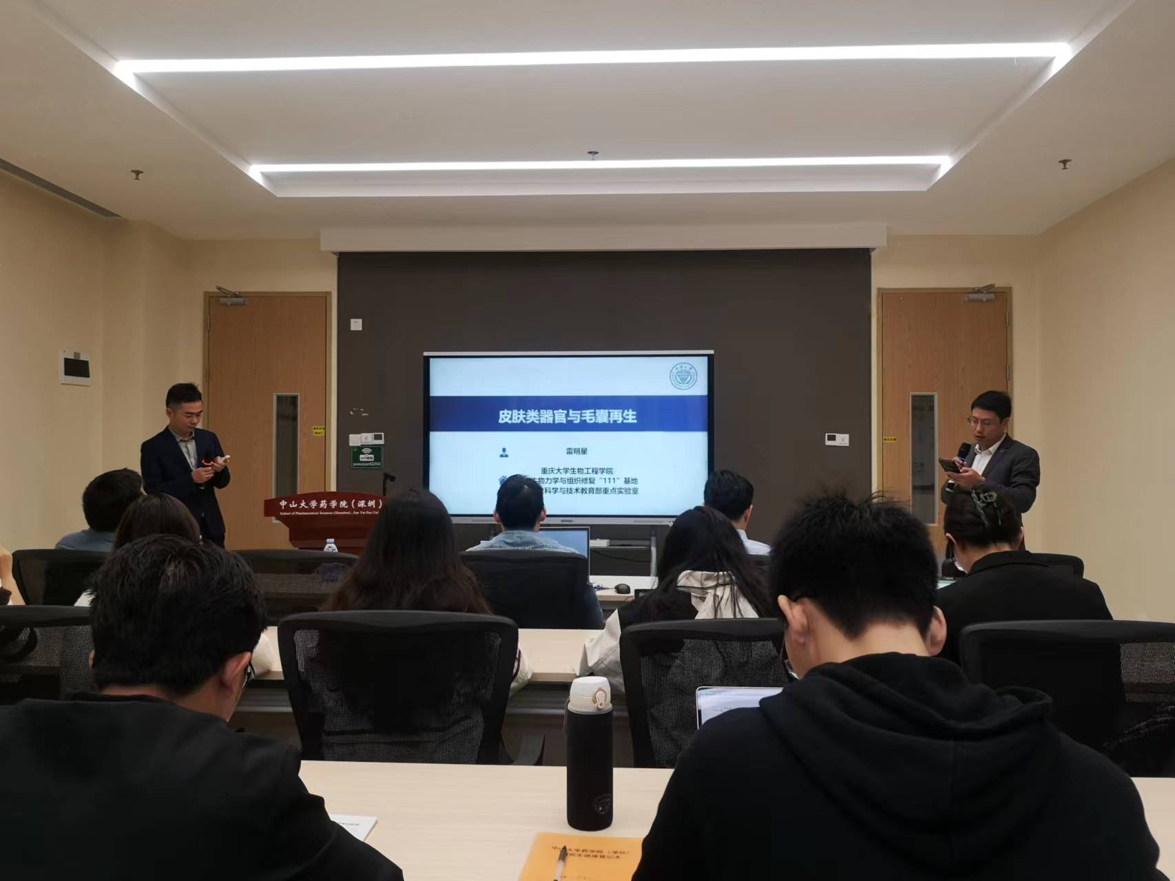 在老师和同学们热烈的掌声中,两位教授进行了详细而精彩的讲解。雷明星教授聚焦皮肤类器官与毛囊再生的主题,深入浅出地为师生们介绍了细胞自组装形成皮肤类器官和毛囊等附属器官的细胞学和分子学机制。针对现有移植毛发治疗脱发的方法缺乏有效毛发来源、老化毛囊不能周期再生的问题,雷教授详细讲解了利用皮肤类器官培养促进皮肤及其附属器官的再生的技术,并通过揭示毛囊周期再生的新机制、揭示脱发等皮肤疾病的病理学机制,为脱发等疾病开拓了新的治疗思路,显著扩宽了师生的视野。