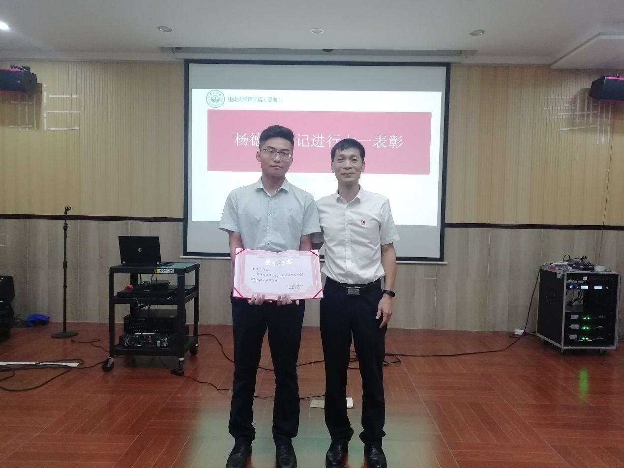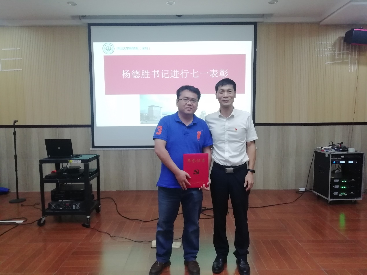 杨德胜书记主持开展了“七一”表彰活动。为获得2021年中山大学优秀共产党员称号的黄怀义同志,获得2021年中山大学优秀党务工作者称号的高理钱同志,颁发荣誉证书,希望他们再接再厉、不断进取,进一步发挥模范带头作用,大力弘扬中国共产党的光荣传统和伟大建党精神,扎实工作、奋发有为、再创佳绩。