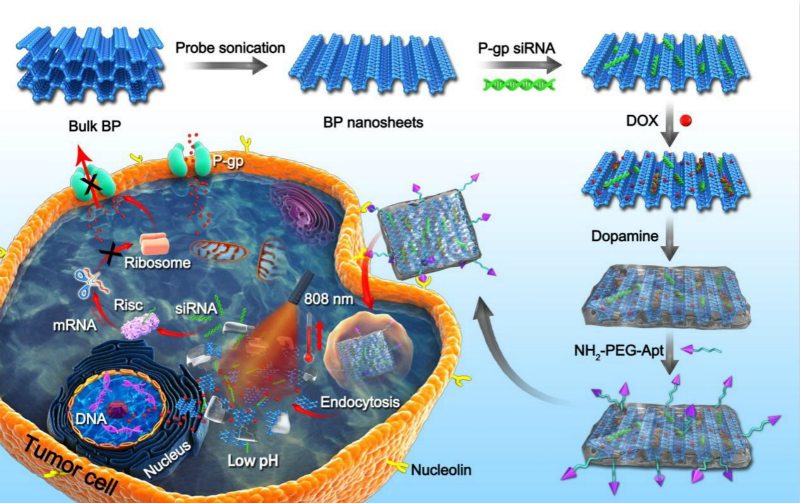 为了解决黑磷在药物载体系统的上述局限,梅林课题组设计了一种简易高效的方法。该项工作在黑磷表面包裹一层仿生的聚多巴胺(Polydopamine, PDA)膜,形成一种“纳米胶囊”结构。聚多巴胺具有良好的生物相容性,可以有效隔离氧气或水与黑磷纳米片的接触,从而提高其稳定性。此外,聚多巴胺自身具有良好的光热效应,因此聚多巴胺的包覆可以进一步增强黑磷药物载体系统的光热效应。在此基础上,科研人员将小干扰RNA(siRNA)和广谱性抗癌药物多柔比星(DOX)负载到了“纳米胶囊”内部,并在聚多巴胺表面修饰上了靶向基团核酸适配体(Aptamer, Apt),制备了一种集化疗、基因治疗和光热治疗于一体的多功能靶向纳米载药平台。目前,该研究在动物体内实验上取得突破,并在乳腺癌模型的裸鼠身上取得了良好的肿瘤治疗效果。