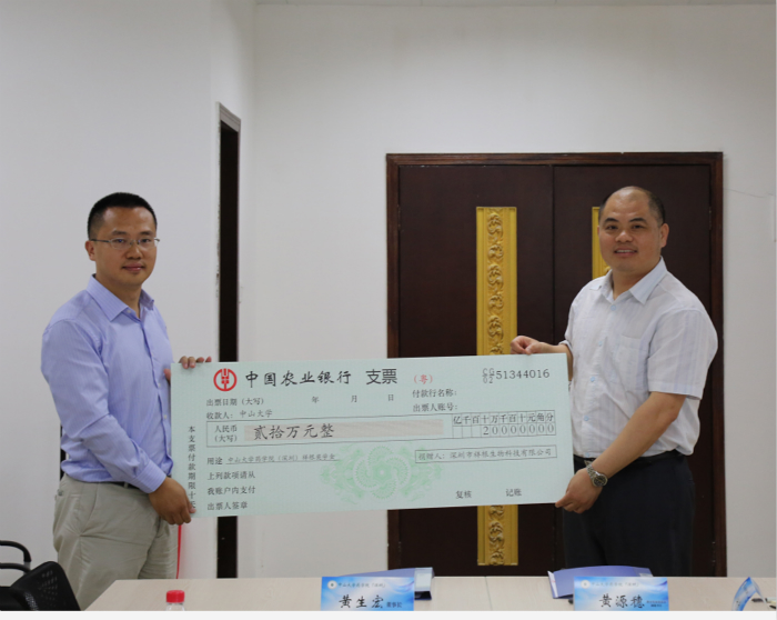 捐赠仪式上,黄生宏董事长与中山大学教育发展基金会副秘书长黄源穗签订捐赠协议,赠送捐赠支票。随后黄源穗副秘书长向黄生宏董事长颁发基金会鸣谢证书。