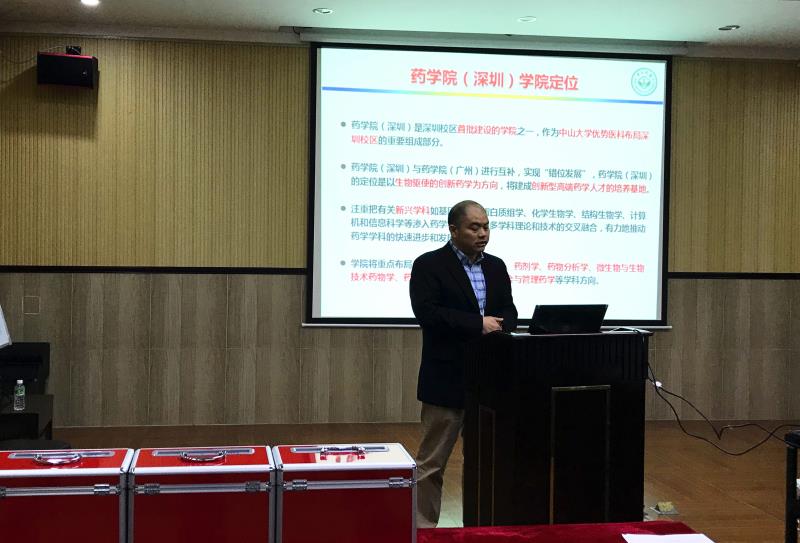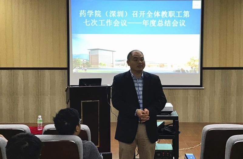 首先,邓文斌院长进行了述职述廉,向全体教职工重点介绍了学院一年来在人才引进、科学研究、平台建设、学生培养和文化建设等方面的进展,并总结了学院存在的问题和提出了相应的解决措施。截止2017年底,全院到岗教职工31人,纵向项目立项数17项,总经费为939万,邓文斌教授牵头申报的“广东省干细胞与创新药物工程技术研究中心”获广东省工程技术研究中心认定,招收本科生95人、研究生11人等等成果,以上成绩的取得表明学院各项已经进步了稳步发展阶段。最后,邓院长希望全体教职工再接再厉,在2018年取得更好的成绩。