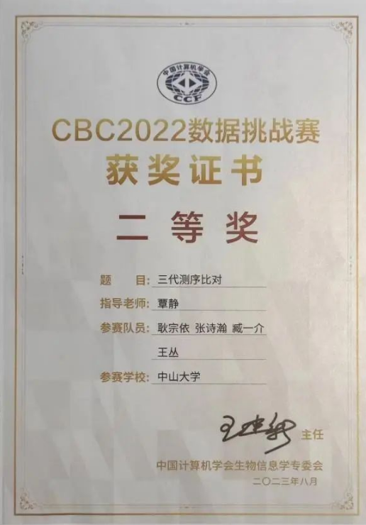 CBC数据挑战赛是由中国计算机学会生物信息学专委会筹办的生物信息学领域的科研竞赛,致力于围绕生物信息领域的热点、难点问题,提出具有创新性的解决方案,助力人工智能在生物信息领域的应用,推动数字化医疗的发展,在国内生物信息学领域颇具影响力。我院2020级本科生耿宗依与2021级本科生王丛、农学院2020级本科生张诗瀚、臧一介组队,在覃静老师的指导下荣获CBC2022数据挑战赛二等奖。