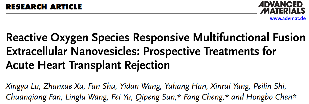 2024年6月,我院陈红波/程芳教授团队在Advanced Materials杂志上发表了一篇题为“Reactive Oxygen Species Responsive Multifunctional Fusion Extracellular Nanovesicles: Prospective Treatments for Acute Heart Transplant Rejection”的研究论文(https://doi.org/10.1002/adma.202406758.)。该研究基于团队前期的小鼠心脏移植排斥早期的单细胞转录组测序分析以及移植早期缺血再灌注(ischemia reperfusion injury,IRI)的机制特征,开发了一种活性氧(reactive oxygen species, ROS)响应型的携带雷帕霉素(rapamycin,RAPA)的多功能动植物融合纳米囊泡(FNVs@RAPA),旨在缓解心脏移植早期IRI和Ly6C+Ly6G-炎性巨噬细胞介导的排斥反应,为改善器官移植患者的排斥反应提供具有临床前景的免疫抑制方案。
