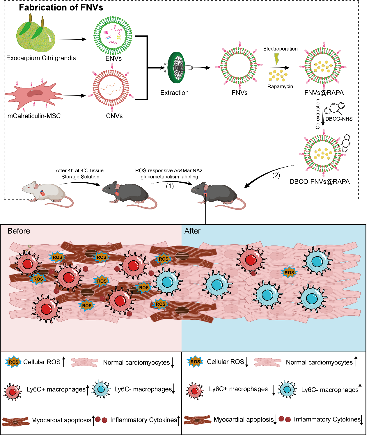 雷帕霉素(rapamycin,RAPA)作为一种mTOR抑制剂,可促进Ly6C+Ly6G-巨噬细胞向Ly6C-Ly6G-免疫抑制型巨噬细胞极化,从而延长移植物的存活。然而,RAPA由于缺乏组织和细胞的靶向性,其长期使用具有严重的毒副作用,包括肾毒性和肝毒性。这意味着提高RAPA对移植组织和炎症巨噬细胞的靶向性将是一种减轻移植部位免疫排斥反应并改善RAPA不良作用的有前景的方法。在此,他们开发了一种“一箭双雕”的策略,既可以实现RAPA在移植心脏部位的主动积累,又可以靶向递送给移植处的炎症巨噬细胞。首先,为了提高雷帕霉素对移植部位炎性巨噬细胞的靶向性,该研究团队基于前期单细胞转录组测序分析发现在移植物内大量浸润的Ly6C+Ly6G-巨噬细胞中吞噬受体信号LRP1高表达的现象, 构建了一个过表达“吃我”信号钙网蛋白(Calreticulin, CALR)的间充质干细胞膜来源的纳米囊泡,并与ENVs融合后负载RAPA,形成载药动植物融合纳米囊泡(FNVs@RAPA)。接着,为了提高FNVs@RAPA对移植心脏的靶向性,他们结合了在缺血再灌注损伤期间释放大量ROS生成的特点和生物正交化学靶向递送的优势,设计了一个ROS响应的Ac4ManAz衍生物(ROS-N3)。在冷缺血再灌注的同种异体心脏移植中,这种ROS响应型生物正交化学方法促进了FNVs@RAPA主动靶向递送至心脏移植部位,有效缓解IRI,并促进Ly6C+Ly6G-炎症巨噬细胞向抗炎表型极化,延长了移植物的存活时间,并展现了良好的治疗安全性。该策略将为开发可在器官移植的早期连续的多个阶段发挥治疗作用的方案提供信息。