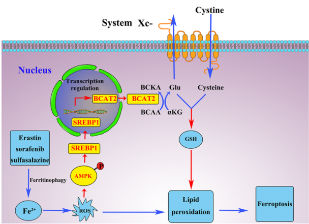 同时,近期该团队还基于CRISPR/Cas9高通量代谢文库筛选技术平台和PDX模型,发现支链氨基酸转移酶2(BCAT2)调控肿瘤细胞铁死亡抵抗的机制,即铁自噬-AMPK-SREBP1途径增强BCAT2转录和酶活性,促进内源性谷氨酸合成增加,降低脂质过氧化水平,引起肝癌和胰腺癌铁死亡抵抗,并拓展了肠道“老药”柳氮磺嘧啶的新用途,发现其联合索拉非尼,抑制肿瘤中BCAT2表达,并显著提升对耐药难治性肝癌和胰腺癌的治疗效果 (Cell Death and Differentiation, 2021, IF=13.7,中科院1区)。团队还设计了靶向肝癌铁死亡的外泌体样囊泡修饰策略,将分泌的转铁蛋白通过一个锚定序列固定表达在膜上,制备成纳米囊泡,包载铁死亡诱导剂索拉非尼,通过膜上的转铁蛋白受体介导的内吞作用进入肝癌细胞,被裂解后释放出索拉菲尼和脂质合成原料铁离子,协同加快脂质过氧化物的积累,导致铁死亡。体外和体内实验都证明,此策略能成功诱导肝癌细胞铁死亡,并且显著抑制皮下瘤和原位肝癌生长 (Biomaterials Research, 2023, IF=15.8)。该工作获得2023年度江苏省科学技术奖三等奖。