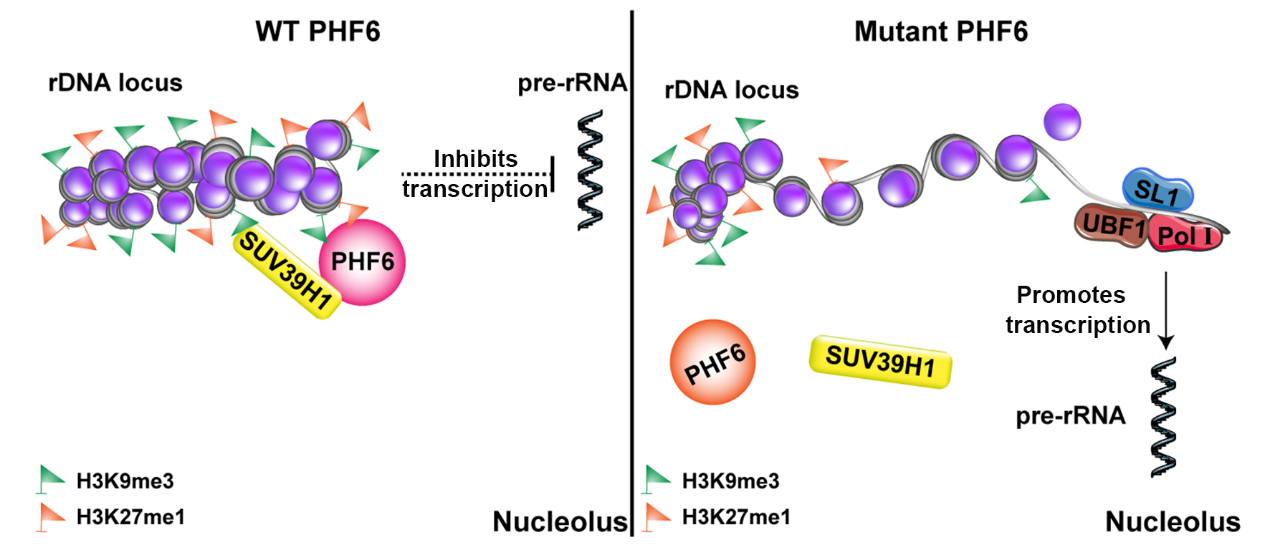 PHF6 招募甲基转移酶 SUV39H1 调控核仁区域组蛋白表观遗传机制示意图