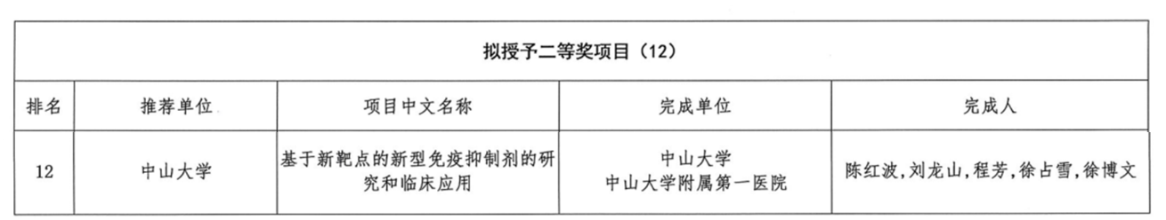 根据《广东医学科技奖管理办法》(粤医会〔2023〕12号)相关要求,广东省医学会组织评审专家对本年度申报科学技术奖和科普奖共125个申报项目通过形式审查、初审、评委会答辩、终审及公示等程序,评出获奖项目32个,其中医学科技奖29个(一等奖9个、二等奖12个、三等奖8个),科普奖3个。我院陈红波和程芳教授团队联合中山大学附属第一医院器官移植科刘龙山主任医师团队申请的“基于新靶点的新型免疫抑制剂的研究和临床研究”项目荣获第六届广东医学科技奖二等奖。