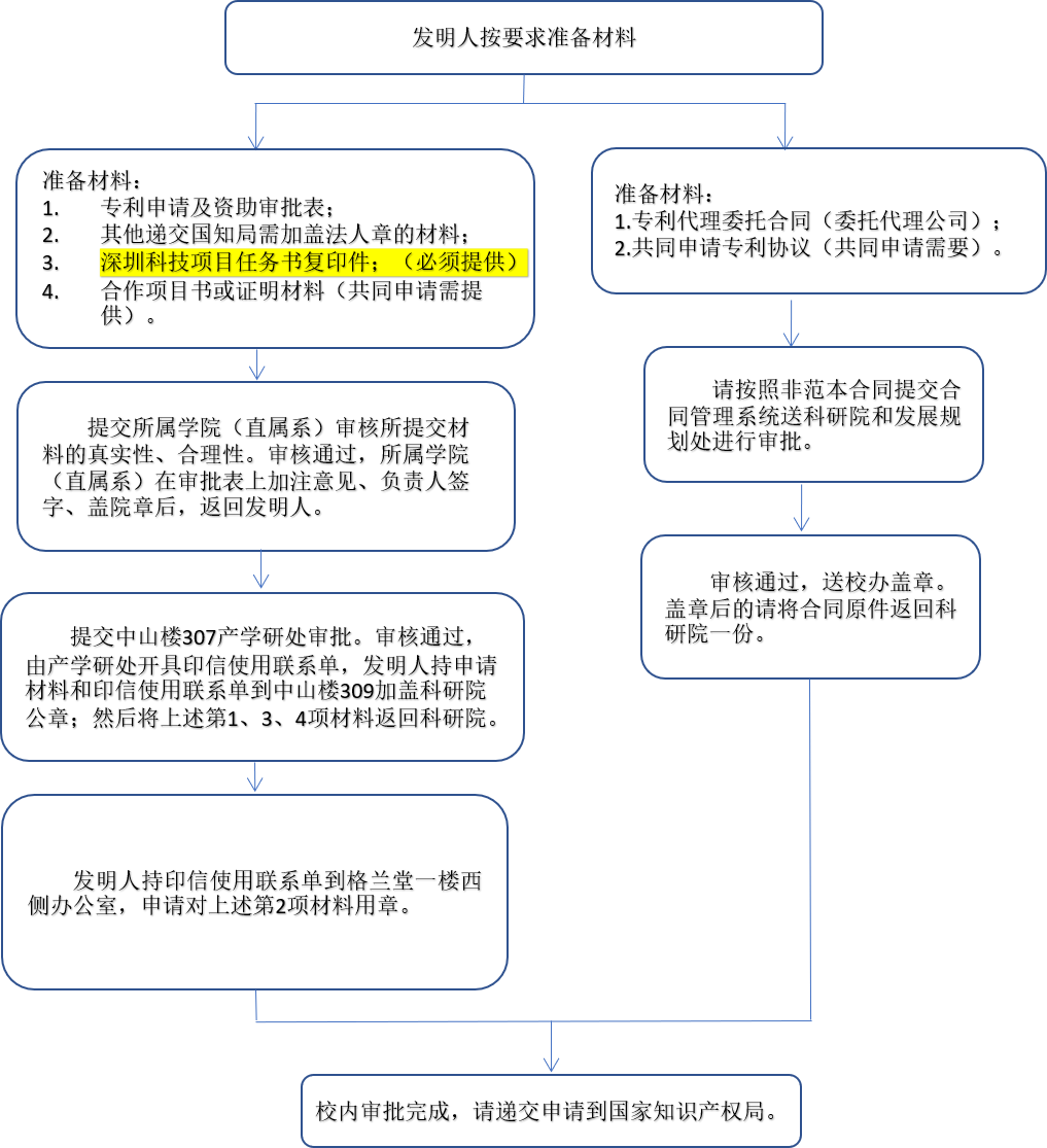 导航痕迹 yl9193永利集团(深圳) 实验中心 服务指南 “中山大学·深圳”专利申请办事流程 扫描此二维码分享 “中山大学·深圳”专利申请办事流程 发布人:网站管理员 发布日期:2020-06-28 提醒:其他事项请参照“中山大学专利申请及授权办事流程指引”。谢谢! 校内审批常用表格_0.zip 专利常用表格(国知局)_0.zip
