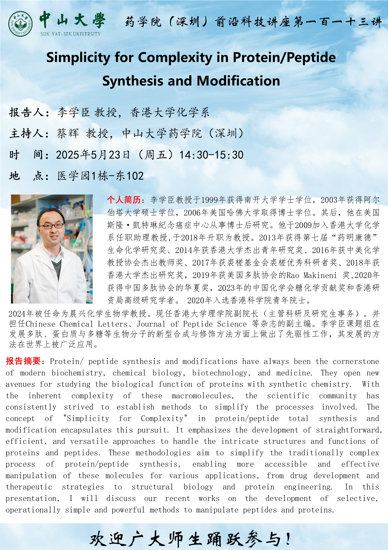 yl9193永利集团(深圳)前沿科技讲座第一百讲:蛋白质/多肽合成与修饰中的以简驭繁