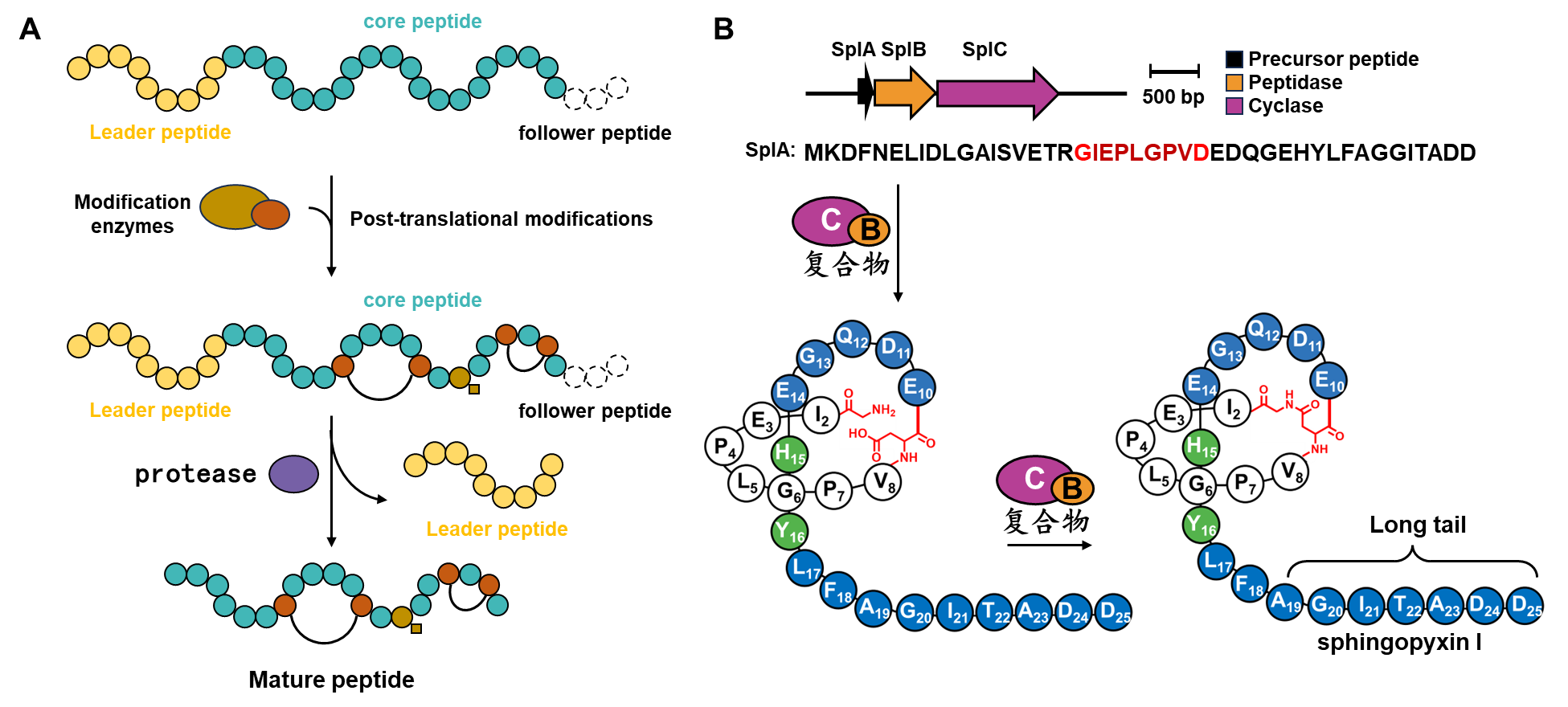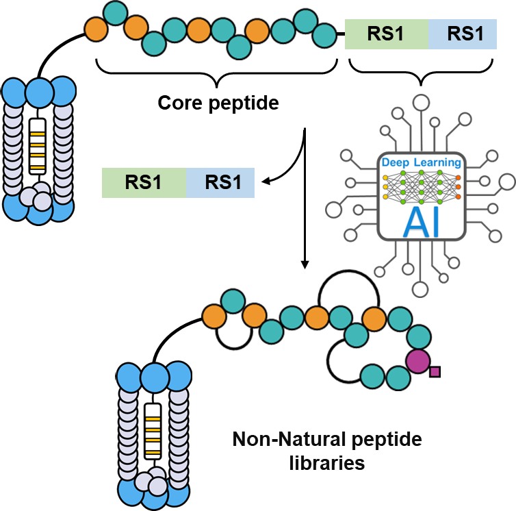 2.深度学习噬菌体展示非天然多肽库。自 George P. Smith 等人首次开创噬菌体展示技术以来,多肽药物分子的筛选便进入了一个崭新的时代。许多结构新颖的多肽药物被成功地筛选并应用于疾病的治疗。尽管如此,噬菌体局限于展示由20种天然氨基酸构成的多肽库,限制了其用于筛选复杂结构的靶标蛋白。我们致力于将肽类天然产物的生物合成途径与噬菌体展示技术相结合,通过深度学习模型评估酶的修饰效率,从而在噬菌体展示的天然肽库中高效引入各种结构复杂的非天然构建块,最终实现噬菌体展示类天然产物多肽库。